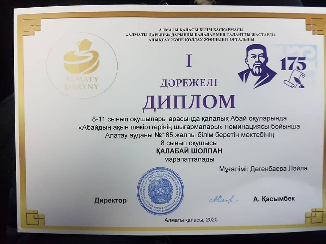 8-11 сынып оқушылары арасында қалалық Абай оқуларында "Абайдың ақын шәкірттерінің шығармалары" номинациясында Алатау ауданы №185 жалпы білім беретін мектебінің 8-сынып оқушысы Қалабай Шолпан І орын иегері атанып, І дәрежелі дипломмен марапатталды.