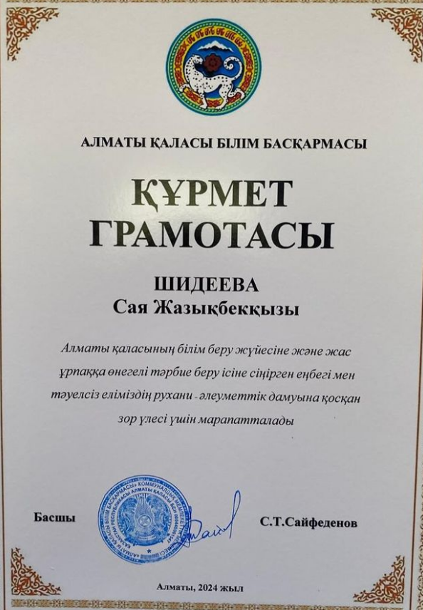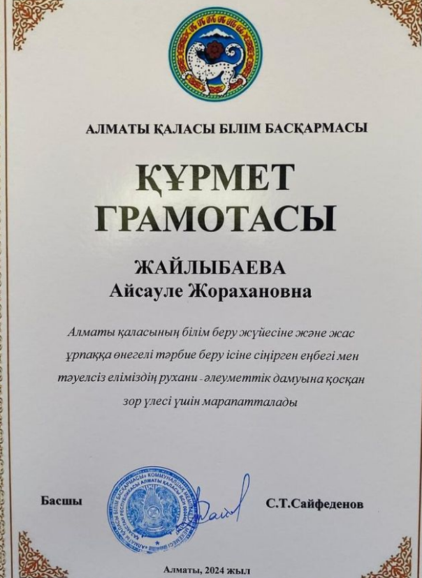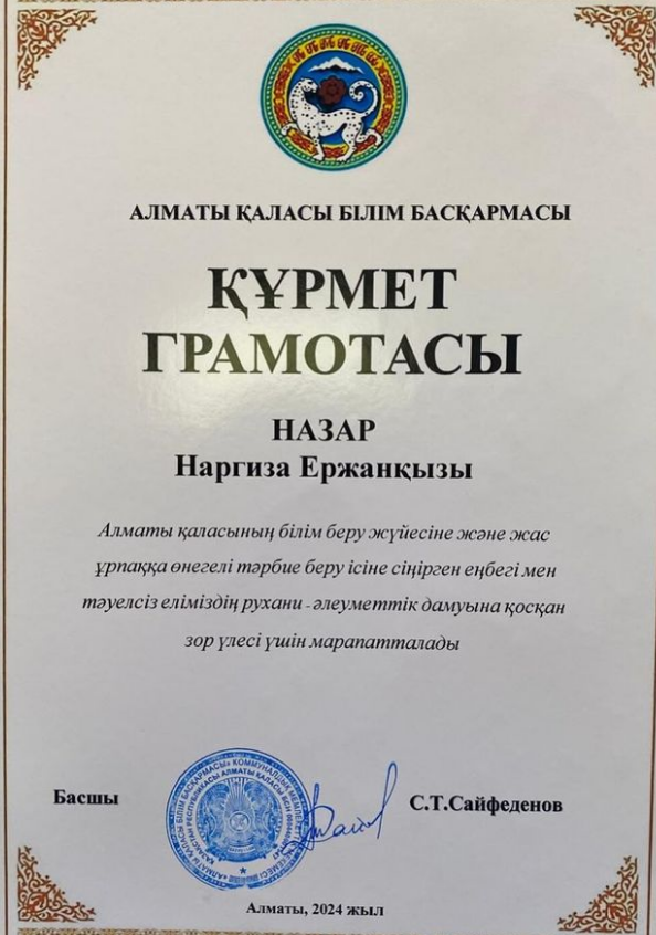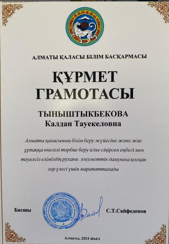 Алматы қаласының білім беру жүйесіне және жас ұрпаққа өнегелі тәрбие беру ісіне сіңірген еңбегі мен тәуелсіз еліміздің рухани-әлеуметтік дамуына қосқан зор үлесі үшін