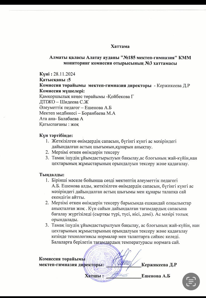 185 мектеп » Ақпарат » "Жалпыға бірдей міндетті оқумен қамту қорынан" бір мезгіз ыстық тамақ ішетін оқушылардың тамақтануын қадағалау бракераждық комиссия мониторингі