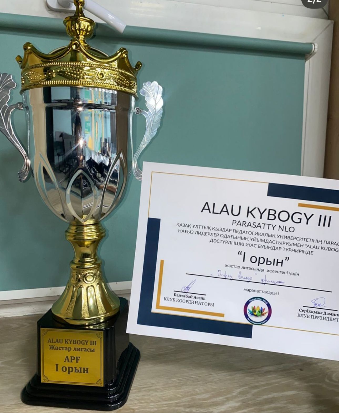 Қазақ Ұлттық Қыздар Педагогикалық Университетінің «Парасатты нағыз лидерлер» одағы ұйымдастырған “AIAU KUBOGY III” қалалық дәстүрлі жас буындар арасындағы пікірсайыс турнирінде Алатау ауданының намысын лайықты қорғап, I орынға ие болды.