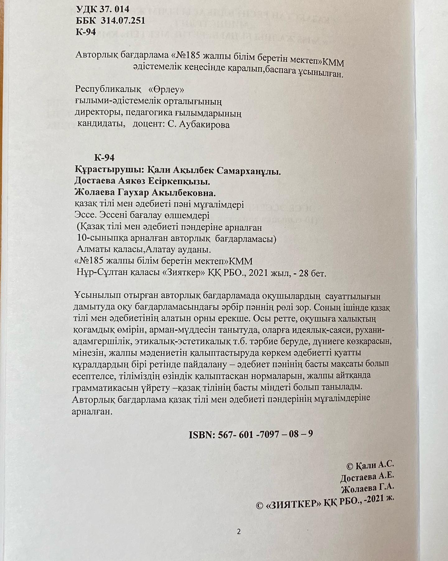 №185 жалпы білім беретін мектебінің қазақ тілі мен әдебиеті пәні мұғалімдері А.С.Қали, А.Е.Достаева, Г.А.Жолаеваның зерттеу жұмыстары нәтижесінде қазақ тілі мен әдебиеті пәні мұғалімдеріне арналған “Эссе. Эссені бағалау өлшемдері” тақырыбында авторлық бағдарламалары жарық көрді. Бағдарламада эссенің алғышарттары, жазылу ерекшелігі қарастырылып, ғылыми сараптамалар мен дәлелдемелер тәжірибеге сүйеніп жазылған.