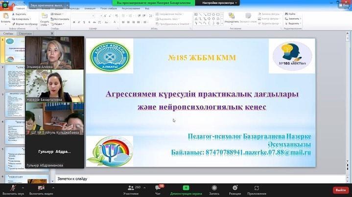 «Қашықтықтан оқыту кезінде балалармен және ересектермен оқытудың және қарым-қатынастың тиімді әдістерін ұйымдастыру» тақырыбында өткен Алматы қаласы білім беру ұйымдары директорларының тәрбие ісі жөніндегі орынбасарларына арналған қалалық семинарда №185 жалпы білім беретін мектебінің педагог-психологі Базарғалиева Назерке Әсемханқызы "Агрессия формалары - оны жеңудің себептері мен формалары" тақырыбында кәсіби тәжірибесімен бөлісіп, зерттеулерін сараптады.