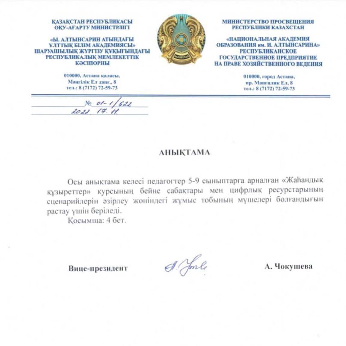 Қазақстан Республикасы Оқу-ағарту министрлігі, Ы.Алтынсарин атындағы Ұлттық Білім Академиясының 5-9 сыныптарға арналған “Жаһандық құзыреттер” курсының бейне сабақтары мен цифрлық ресурстарының сценарийлерін әзірлеу жөніндегі жұмыс тобының мүшесі Ақыл Самарханұлына Ы.Алтынсарин атындағы Ұлттық Білім Академиясының авторлық әзірлеуші құқықтағы анықтамасы берілді.